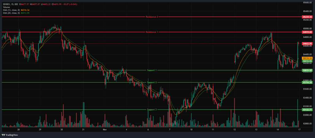 The BSE Sensex Index opened on a negative note at 84,060.14 on Friday, down by 418.53 points from Thursday’s closing of 84,478.67. The Sensex index opened on a gap-down note and dragged down to the 84,000 level and was traded between the range of 84,000 and 84,500 during the morning session. In the afternoon session, the index fell as low as the 84,029 level, marking its day low and later recovered from the day’s low to peak at the day’s high at 84,698. The Index was traded between the range of 84,000 and 84,700.