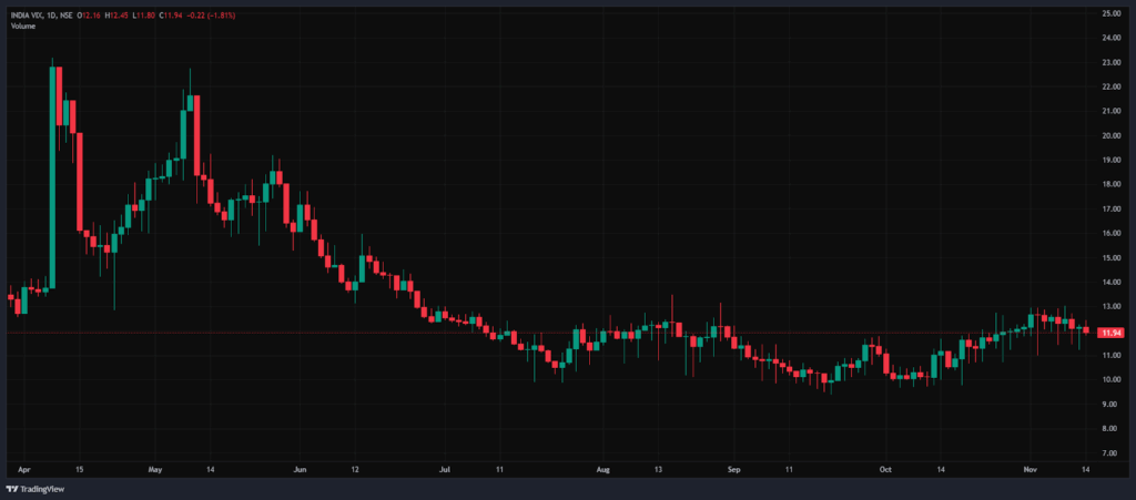 The India VIX decreased 0.23 points or 1.85%, from 12.16 to 11.94 during Friday’s session. A decrease in the India VIX typically indicates lower price volatility in the stock market, suggesting a more stable market environment. However, a stable market environment and minimal volatility are anticipated when the India VIX is below 15.