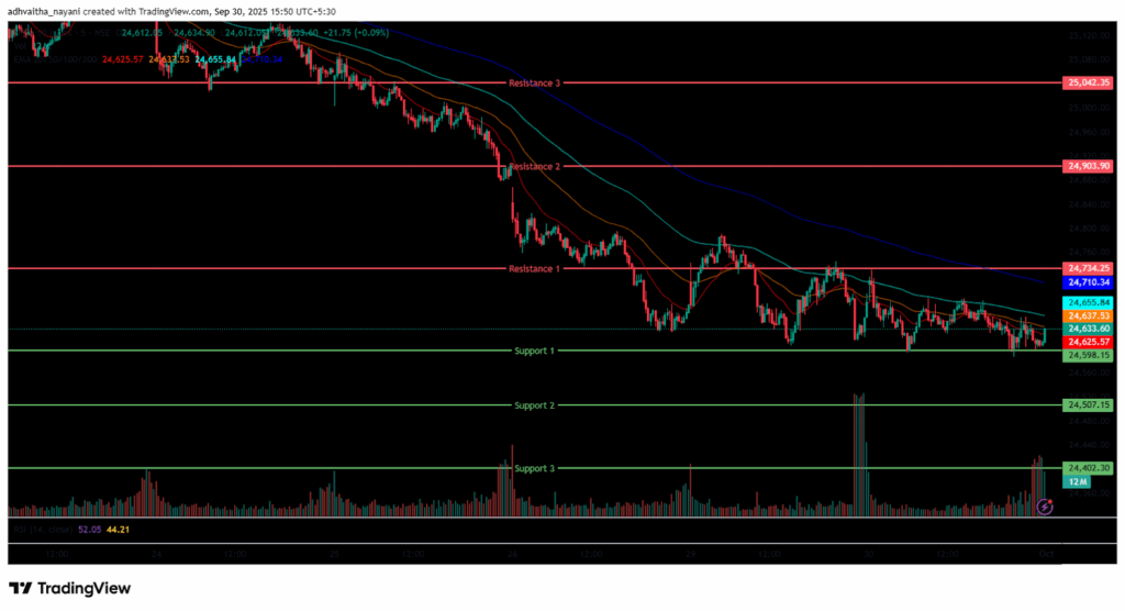 Further, the index lost its momentum and fell as low as the 24,588 mark, the day’s low in the afternoon session, and was traded below its opening level, between the range of 24,550 and 24,650. During the afternoon session, the Nifty 50 traded below all four EMAs of 20/50/100/200 in the 15-minute time frame. Nifty’s immediate resistance levels are R1 (24,734), R2 (24,904), and R3 (25,042), while immediate support levels are S1 (24,598), S2 (24,507), and S3 (24,402).