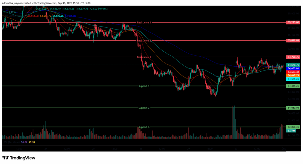 In the afternoon session, the Index lost its momentum and fell as low as the 54,538 level and was traded around the range of 54,500 and 54,700, ending in green. During the afternoon session, Bank Nifty closed below the EMAs of 100/200 but above the 20/50-period EMA in the 15-minute time frame. Bank Nifty immediate resistance levels are R1 (54,791), R2 (55,022), and R3 (55,275), while immediate support levels are S1 (54,385), S2 (54,080), and S3 (53,809).