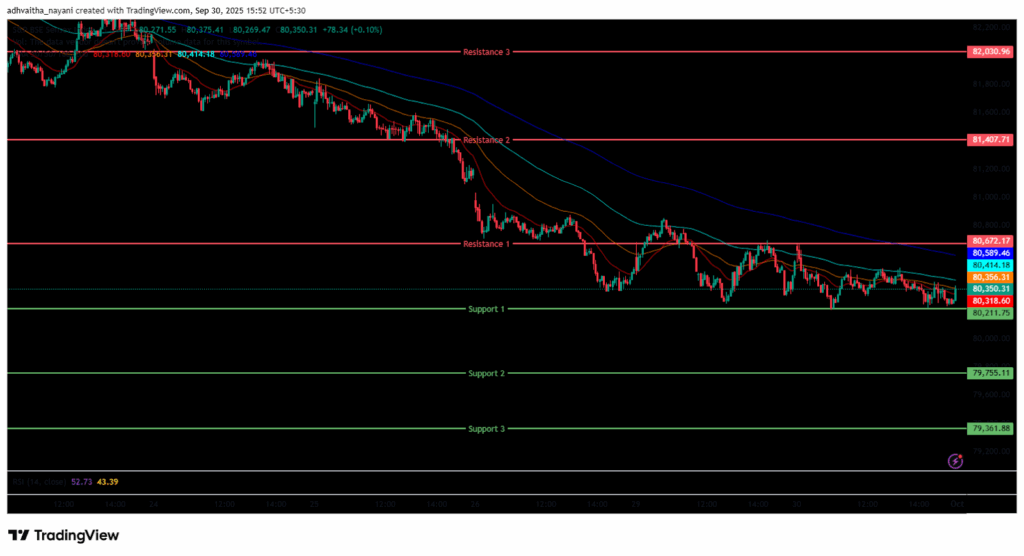 In the afternoon session, the Index traded in a range bound between 80,200 and 80,500, maintaining its overall bearish trend and closing below all four EMAs of 20/50/100/200 in the 15-minute time frame. BSE Sensex immediate resistance levels are R1 (80,672), R2 (81,408), and R3 (82,031), while immediate support levels are S1 (80,212), S2 (79,755), and S3 (79,362).