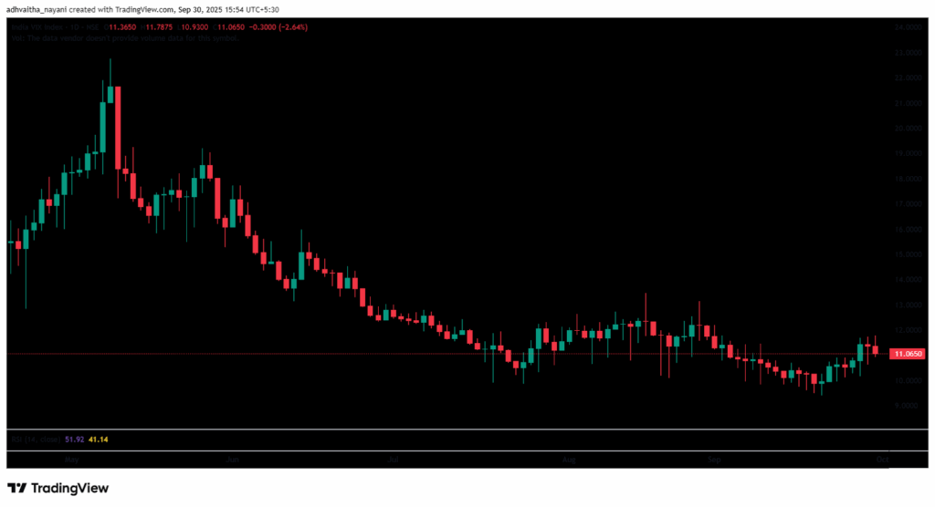 The India VIX decreased by 0.30 points or 2.64%, from 11.36 to 11.06 during Tuesday’s session. A decrease in the India VIX typically indicates lower price volatility in the stock market, suggesting a more stable market environment. However, a stable market environment and minimal volatility are anticipated when the India vix is below 15.