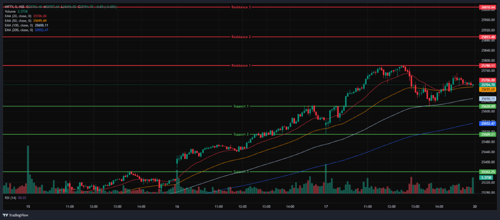 Further, the index declined and settled above the 25,700 level and was trading in the range of 25,600 and 25,800. During the afternoon session, the Nifty 50 closed above all four EMAs of 20/50/100/200 in the 15-minute time frame. The Nifty’s immediate resistance levels are R1 (25,780), R2 (25,893), and R3 (26,011), while immediate support levels are S1 (25,620), S2 (25,509), and S3 (25,362).