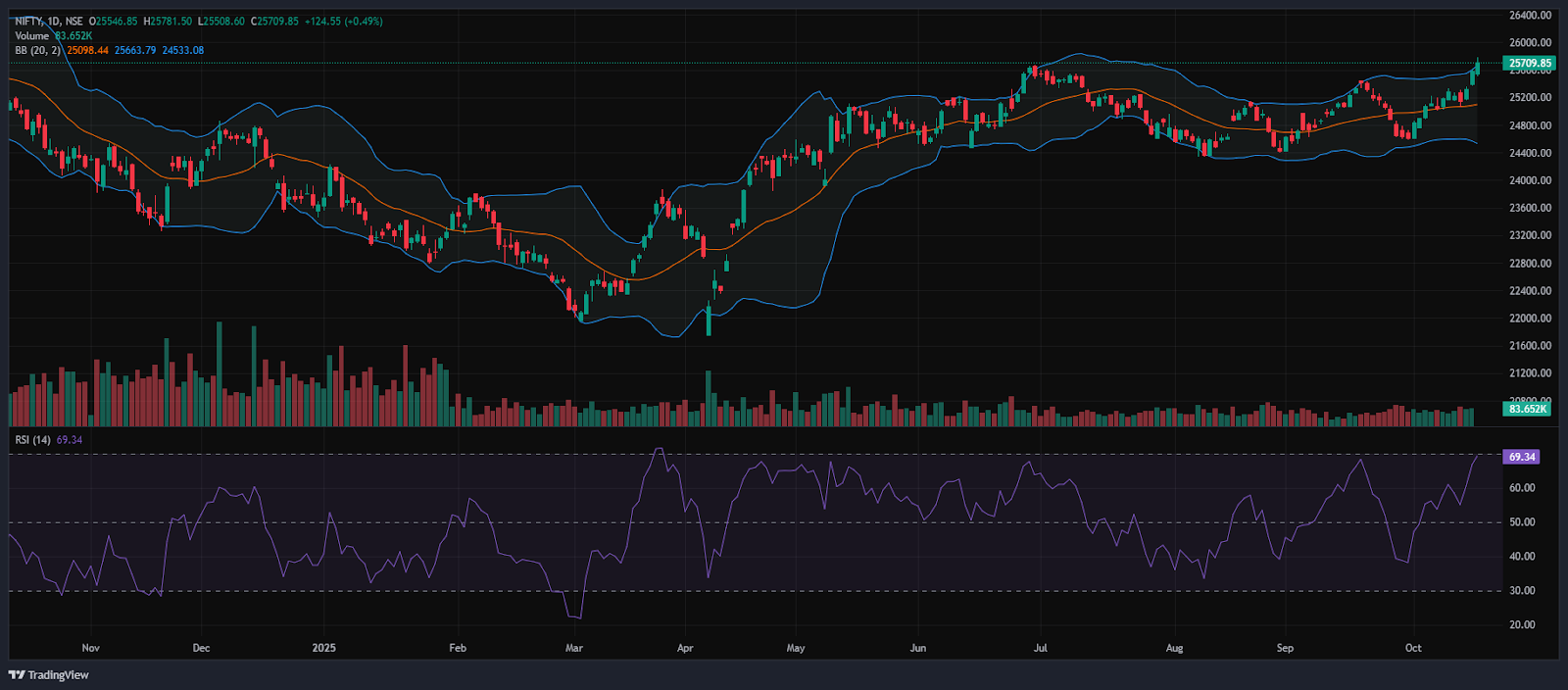 Bollinger Bands (Daily): The index is trading in the upper band of the Bollinger Band range above the middle band (Simple Moving Average). Its position in the upper range indicates a bullish sentiment, and the Index took support near the 25,508 and 25,781 acted as a resistance level. A sustained move above the middle band signals a bullish sentiment, while a drop back toward the lower band may reinforce bearish sentiment.