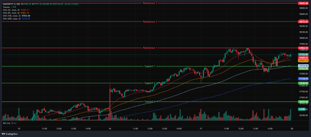 The Bank Nifty Index started the session on a negative at 57,362.90 on Friday, down 59.65 points from Thursday’s closing of 57,422.55. The index was trading between the range of 57,200 and 57,850 in the morning session and surged as high as 57,830, trading at its all-time high in the morning session. In addition, the index was trading above all four EMAs of 20/50/100/200 in the 15-minute time frame. In the afternoon session, the Index declined and settled above the 57,700 mark.