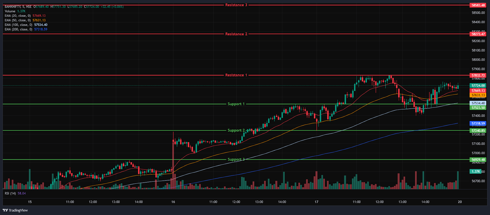 Further, the Index was trading in the range of 57,350 and 57,800, and ended in green above its opening level. During the afternoon session, Bank Nifty closed above all four EMAs of 20/50/100/200 in the 15-minute time frame. The Bank Nifty’s immediate resistance levels are R1 (57,833), R2 (58,273), and R3 (58,583), while immediate support levels are S1 (57,523), S2 (57,241), and S3 (56,929).