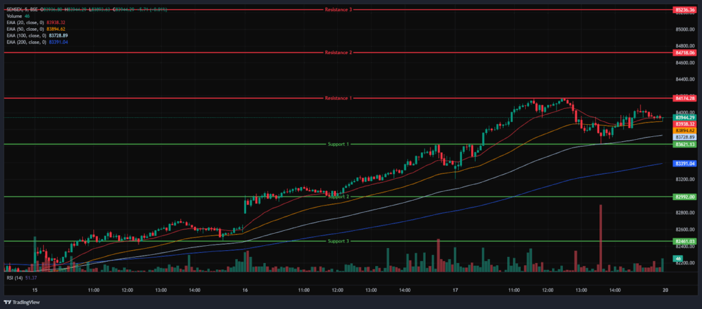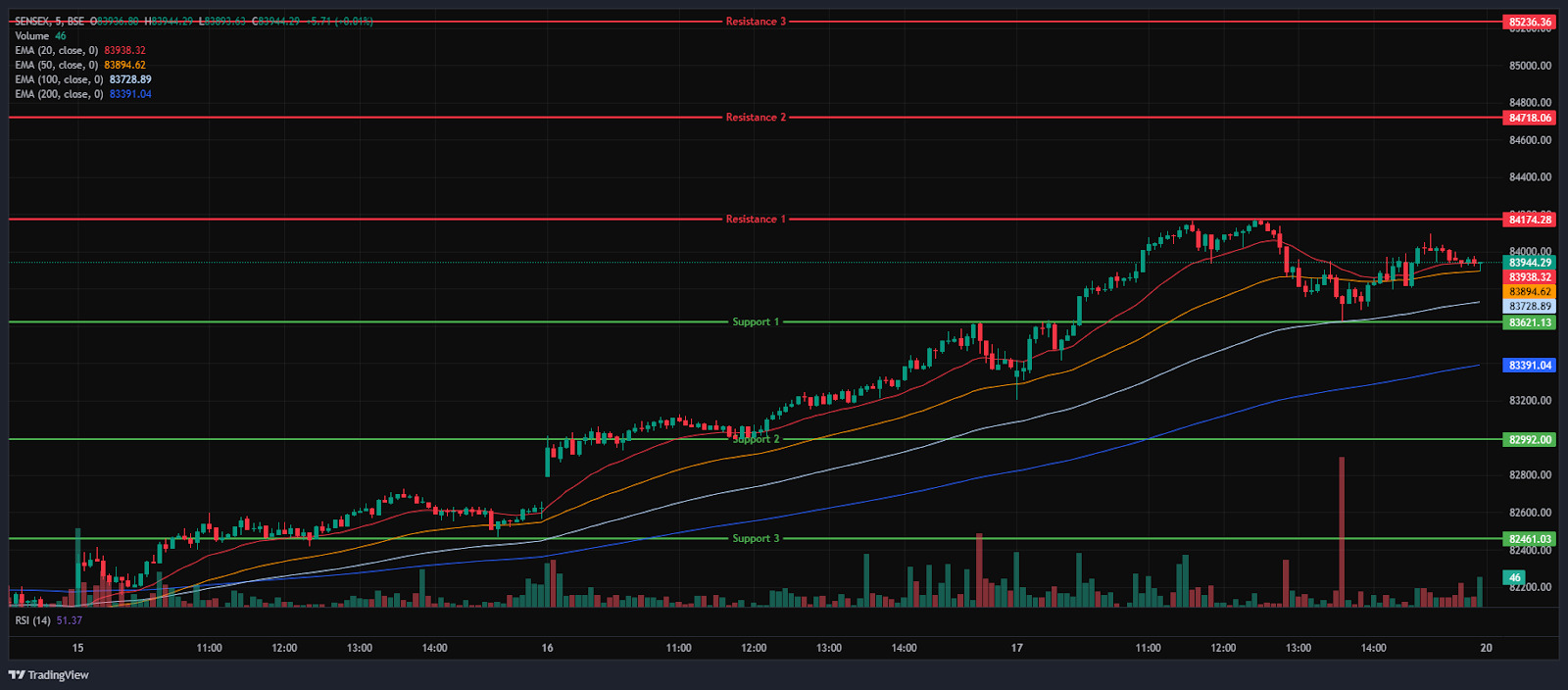 In the afternoon session, the Index declined and settled above the 83,900 level. The Index was trading around 83,600 and 84,150, maintaining its overall bullish trend and closing above the EMAs of 20/50/100/200 in the 15-minute time frame. The BSE Sensex immediate resistance levels are R1 (83,621), R2 (82,992), and R3 (82,461), while immediate support levels are S1 (84,174), S2 (84,718), and S3 (85,236).