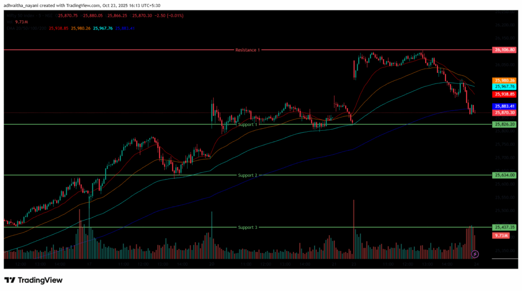 In the afternoon session, the index hit a fresh 52-week high at 26,104.2, marking its intraday peak. However, it later slipped to the 25,850 level and continued to trade within the 25,850-26,150 range. During the afternoon session, the Nifty 50 was closed below the EMAs of 20/50 but remained above the EMAs of 100/200 in the 15-minute time frame. The Nifty’s immediate resistance level is at R1 (26,107), while immediate support levels are S1 (25,826), S2 (25,634), and S3 (25,437).