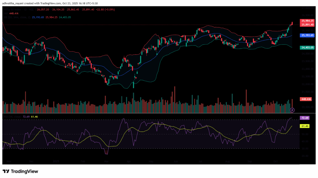 Bollinger Bands (Daily): The index is trading in the upper band of the Bollinger Band range above the middle band (Simple Moving Average). Its position in the upper range indicates a bullish sentiment, and the Index took support near the 25,862 level and 26,104 level acted as a resistance. A sustained move above the middle band signals a bullish sentiment, while a drop back toward the lower band may reinforce bearish sentiment.