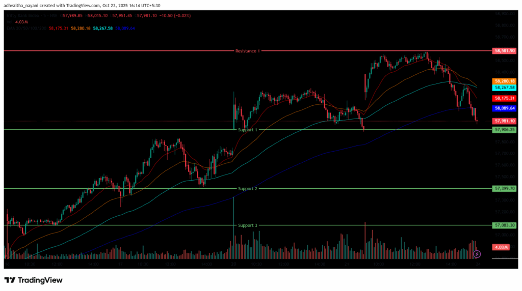 In the afternoon session, the Index dragged down to the 57,981 level but later settled above the 58,000 mark. Further, the Index was trading in the range of 57,950 and 58,600, and ended in green. During the afternoon session, Bank Nifty closed below the EMAs of 20/50 but remained above the EMAs of 100/200 in the 15-minute time frame. The Bank Nifty’s immediate resistance level is at R1 (58,582), while immediate support levels are S1 (57,906), S2 (57,400), and S3 (57,083).