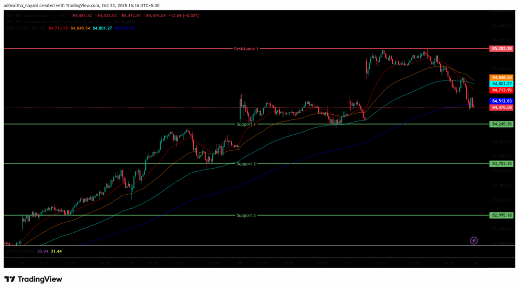 In the afternoon session, the Index lost its momentum and ended near the 84,476 level. The Index was trading around 84,400 and 85,300, maintaining its overall bullish trend and closing below the EMAs of 20/50 but remained above the EMAs of 100/200 in the 15-minute time frame. The BSE Sensex immediate resistance level is at R1 (85,283), while immediate support levels are S1 (84,245), S2 (83,703), and S3 (82,995).