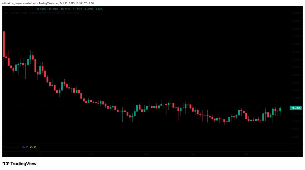 The India VIX increased by 0.44 points or 3.85%, from 11.30 to 11.73 during Thursday’s session. An increase in the India VIX typically indicates higher price volatility in the stock market, suggesting a less stable market environment. However, a stable market environment and minimal volatility are anticipated when the India VIX is below 15.