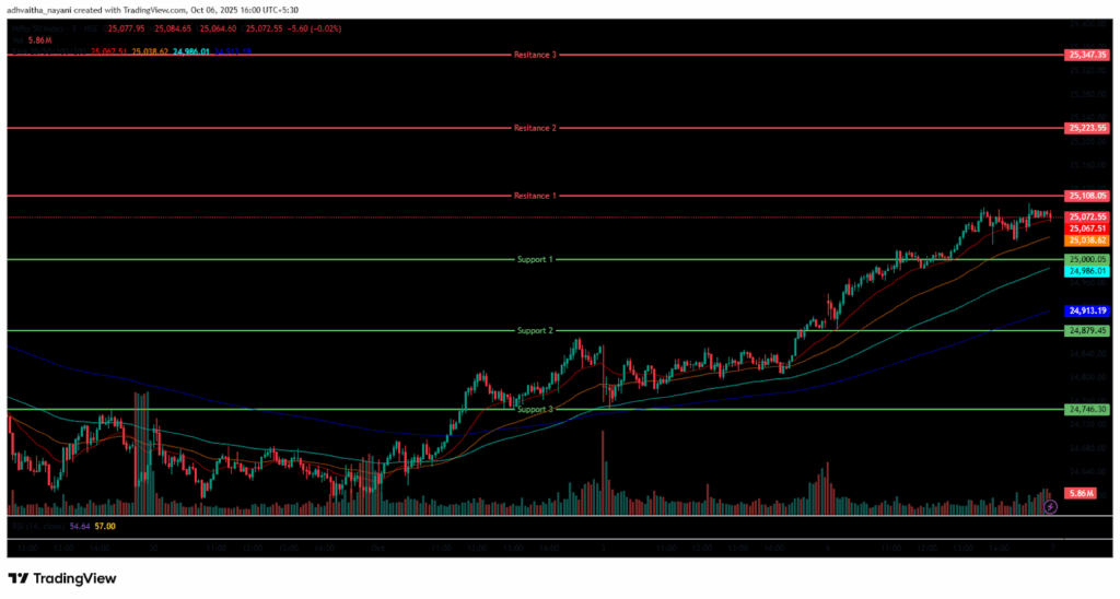 Further, the index gained its momentum and surged as high as the 25,096 mark, the day’s high in the afternoon session, and was traded above its opening level, between the range of 25,000 and 25,100. During the afternoon session, the Nifty 50 traded above all four EMAs of 20/50/100/200 in the 15-minute time frame. Nifty’s immediate resistance levels are R1 (25,108), R2 (25,223), and R3 (25,347), while immediate support levels are S1 (25,000), S2 (24,879), and S3 (24,746).