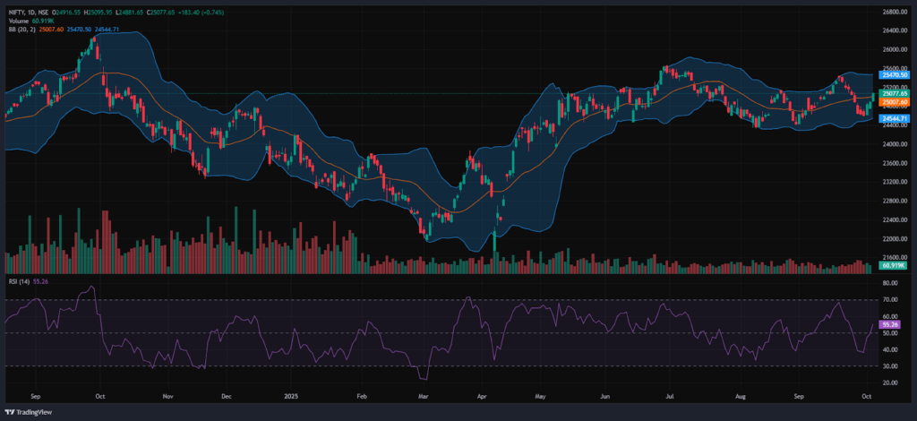 Bollinger Bands (Daily): The index is trading in the upper band of its Bollinger Band range above the middle band (Simple Moving Average). Its position in the upper range indicates a bullish sentiment and on Monday the Nifty Index formed Strong Bullish Candle in the daily time frame by breaking above the previous Resistance levels of 24,900 and 25,000. A sustained move above the middle band signals a bullish sentiment, while a drop back toward the lower band may reinforce bearish sentiment.