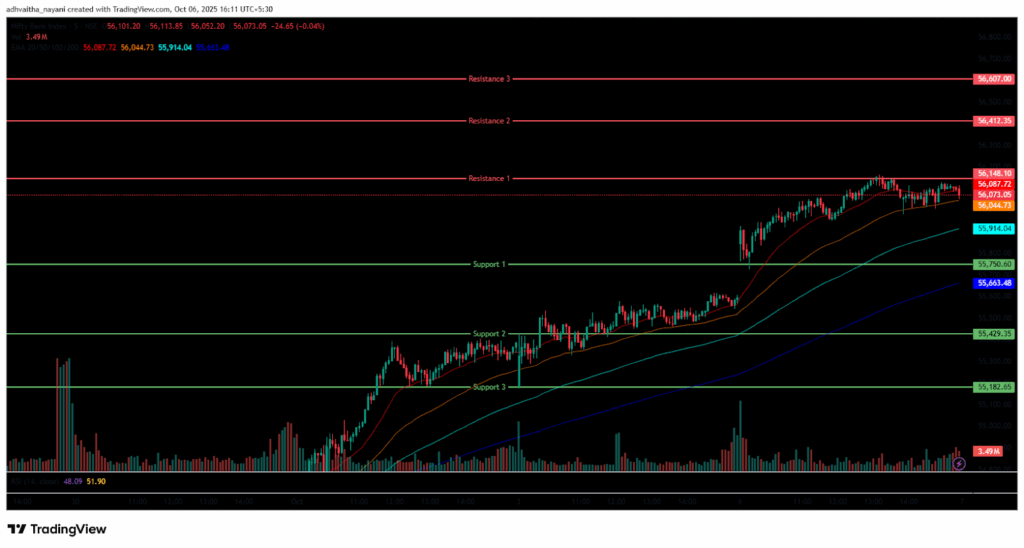 Momentum indicators showed moderate strength, with the RSI at 55.26 for the Nifty 50 and 54.64 for the Sensex, both well below the overbought threshold of 70 and nearing oversold territory. Banking stocks also contributed to the broader market gains. The Bank Nifty Index advanced 515.6 points, or 0.93%, closing at 56,104.85. Monday marked the third straight session of gains for Indian benchmark indices, supported by strength in financial stocks and encouraging Q2 business updates.