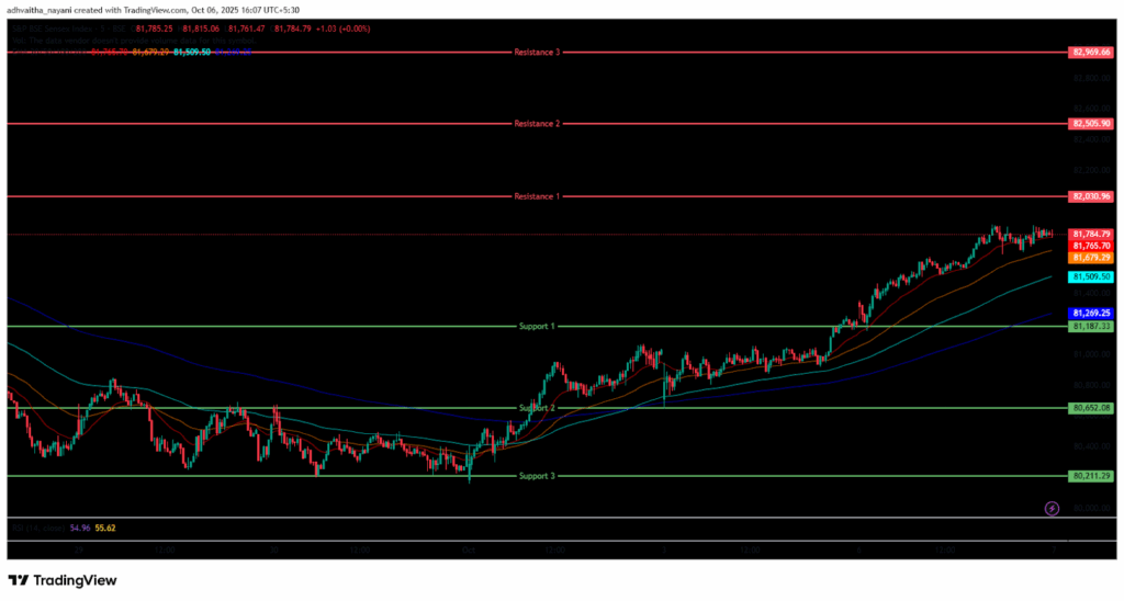 In the afternoon session, the Index further surged to the 81,846 level, marking its day high and was traded between 81,550 and 81,850, maintaining its overall bullish trend and closing above all four EMAs of 20/50/100/200 in the 15-minute time frame. BSE Sensex immediate resistance levels are R1 (82,031), R2 (82,506), and R3 (82,970), while immediate support levels are S1 (81,187), S2 (80,652), and S3 (80,211).