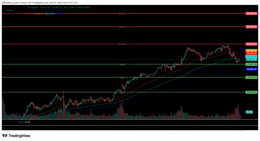 Further, the index surged as high as the 25,221 mark, the day’s high in the afternoon session, and was later dragged down from day high, was traded near its opening level, between the range of 25,050 and 25,250. During the afternoon session, the Nifty 50 traded above the EMAs of 50/100/200 but below the 20-period EMA in the 15-minute time frame. Nifty’s immediate resistance levels are R1 (25,223), R2 (25,347), and R3 (25,442), while immediate support levels are S1 (25,079), S2 (24,985), and S3 (24,879).