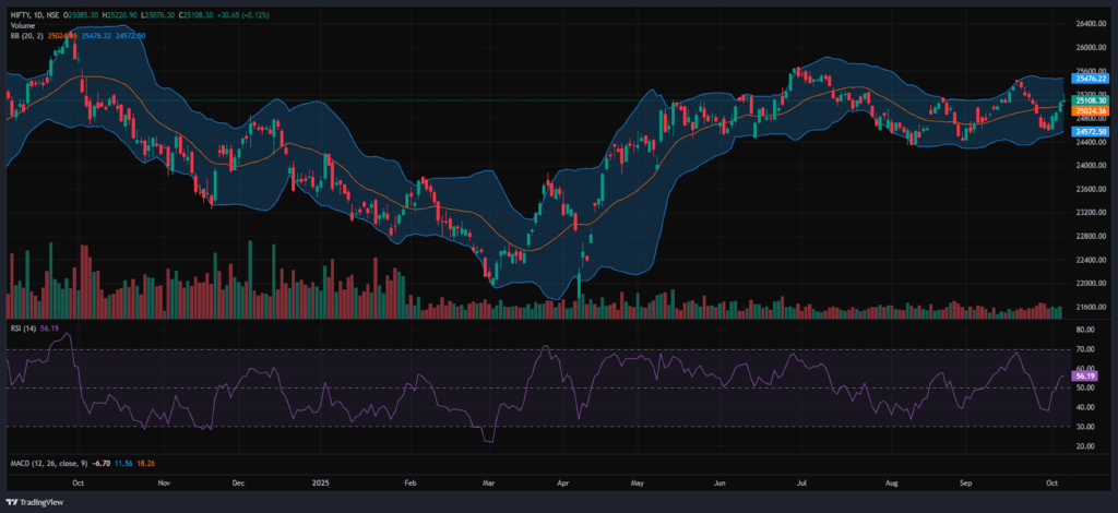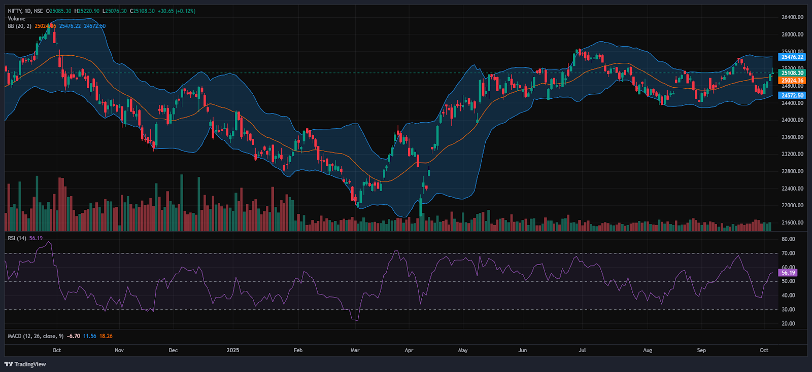 Bollinger Bands (Daily): The index is trading in the upper band of its Bollinger Band range above the middle band (Simple Moving Average). Its position in the upper range indicates a bullish sentiment and on Tuesday the Nifty Index formed a shooting star Candle pattern in the uptrend, signalling a potential bearish reversal. A sustained move above the middle band signals a bullish sentiment, while a drop back toward the lower band may reinforce bearish sentiment.