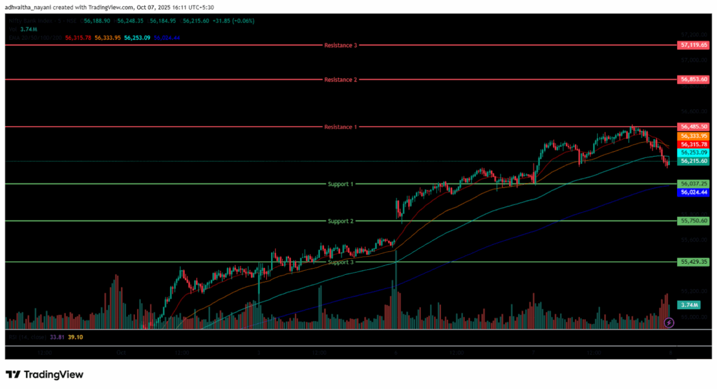 The Index was traded around the range of 56,150 and 56,500, ending in green. During the afternoon session, Bank Nifty closed above the EMAs of 50/100/200 but below the 20-period EMA in the 15-minute time frame. Bank Nifty immediate resistance levels are R1 (56,485), R2 (56,854), and R3 (57,120), while immediate support levels are S1 (56,037), S2 (55,751), and S3 (55,429).