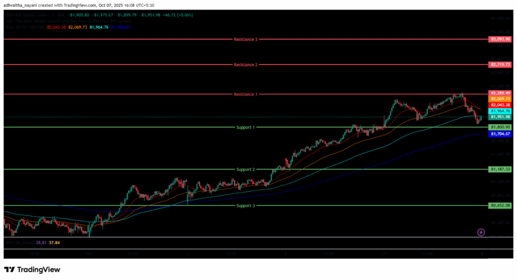 The Index was traded between 81,850 and 82,350, maintaining its overall bullish trend and closing above the EMAs of 50/100/200 but below the 20-period EMA in the 15-minute time frame. BSE Sensex immediate resistance levels are R1 (82,289), R2 (82,720), and R3 (83,094), while immediate support levels are S1 (81,801), S2 (81,187), and S3 (80,652).