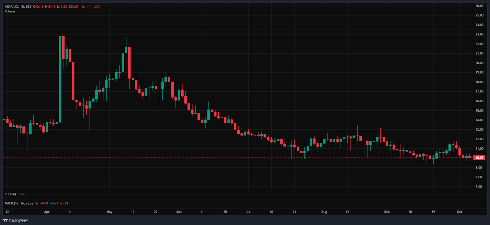 The India VIX decreased by 0.14 points or 1.40%, from 10.19 to 10.05 during Tuesday’s session. A decrease in the India VIX typically indicates lower price volatility in the stock market, suggesting a more stable market environment. However, a stable market environment and minimal volatility are anticipated when the India vix is below 15.
