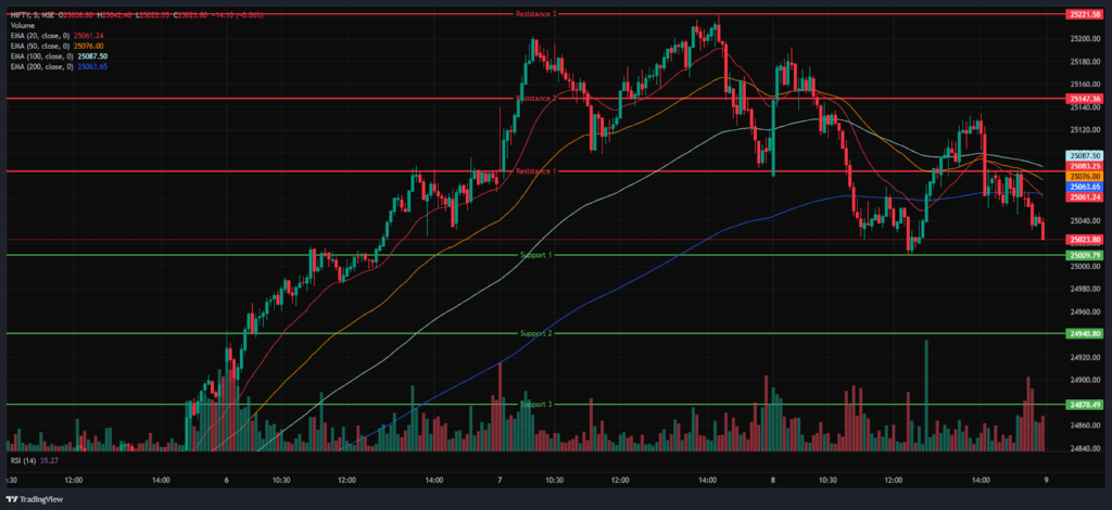 Further, the index surged as high as the 25,150 mark in the afternoon session and was later dragged down to the 25,000 level and was traded in the range of 25,000 and 25,150. During the afternoon session, the Nifty 50 traded below the EMAs of 20/50/100 but above the 200-period EMA in the 15-minute time frame. Nifty’s immediate resistance levels are R1 (25,083), R2 (25,147), and R3 (25,222), while immediate support levels are S1 (25,010), S2 (24,941), and S3 (24,878).