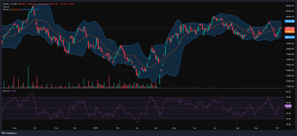 The BSE Sensex index had peaked at 82,257.74 and made a day’s low at 81,646.08. Finally, it had closed at 81,773.66 in red, losing 153.09 points or 0.19%. The Relative Strength Index (RSI) stood at 54.08 (below the overbought zone of 70) in the daily time frame, and the BSE Sensex closed above all four EMAs of 20/50/100/200 in the daily time frame.