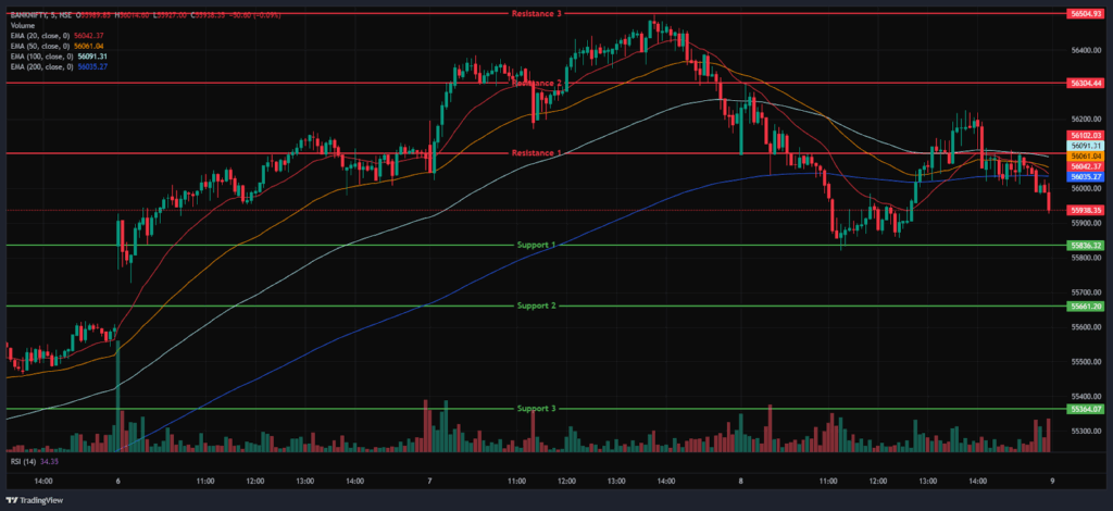 The Index was traded around the range of 55,950 and 56,250, ending in red. During the afternoon session, Bank Nifty closed below the EMAs of 20/50 but above the 100/200-period EMAs in the 15-minute time frame. Bank Nifty immediate resistance levels are R1 (56,102), R2 (56,304), and R3 (56,505), while immediate support levels are S1 (55,836), S2 (55,661), and S3 (55,364).