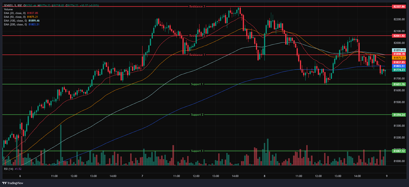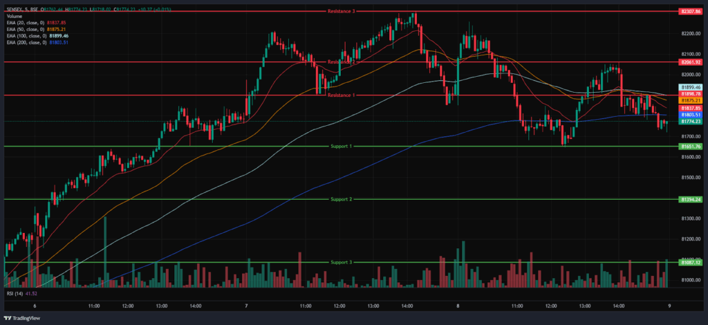 The Index was traded between 81,700 and 82,100, maintaining its overall bearish trend and closing below the EMAs of 20/50 but above the 100/200-period EMA in the 15-minute time frame. BSE Sensex immediate resistance levels are R1 (81,899), R2 (82,062), and R3 (82,308), while immediate support levels are S1 (81,652), S2 (81,394), and S3 (81,087).